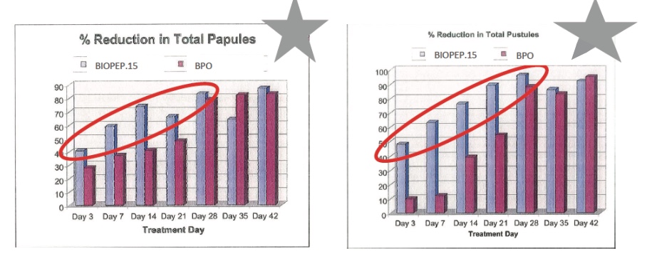 ▲Biopep‧15與一般抗痘成份BPO 相對照,在早晚使用一次,維持6周,其作用明顯較高。