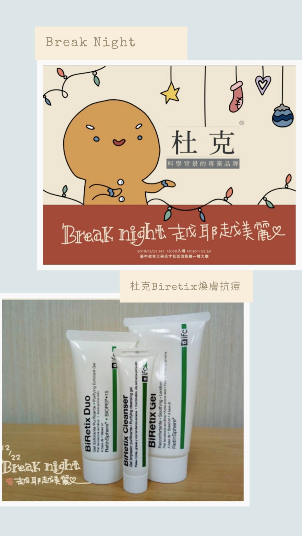 2018年接近尾聲了!在BREAK NIGHT活動中可以藉此機會充電一下!這次搭配「越耶越美麗」主題,杜克一起幫大家實現美麗夢想,特別贊助年輕族群「杜克B 煥膚抗痘」系列,幫助大家一起戰「痘」。有痘痘肌困擾、想預防生理痘的這些捧友們有福了,杜克B是由義大利專業醫師團隊研發的新科技寡胜肽成分,專為溫和調理痘痘肌的保養品,有效改善易痘肌體質,和臉上油光說BYE BYE,可以重新找回自信美麗哦!